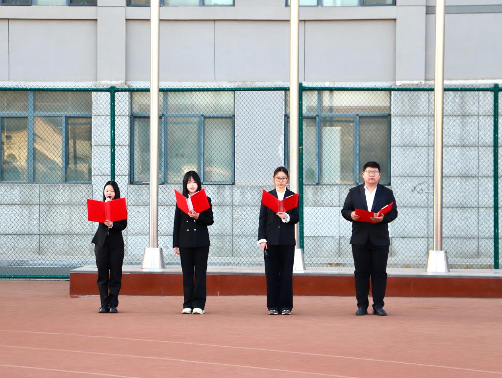 国旗礼毕,我院学生代表2024级经济学专业魏丹阳、2024级工商管理专业李妍、2024级会计学专业陈炳仁和2024级会计学专业杨珊四位同学为我们带来了国旗下的朗诵。他们的声音或激昂高亢,或深情婉转,用真挚的情感和优美的辞藻,以时空经纬编织壮阔画卷,以如椽诗笔熔铸百年风华。新时代青年当以此磅礴之声为号,进一步坚定“感党恩 听党话 跟党走”的决心和信心,在历史坐标上镌刻青春的印记。
