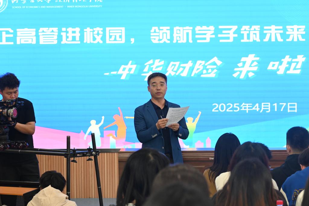 为深化产教融合协同育人机制,帮助学生把握行业发展趋势、提升职业规划能力,2025年4月17日下午,新葡萄官网amg在知行楼(经管楼)116报告厅,举行了“名企高管进校园·领航学子筑未来”保险行业知识讲座。本次讲座特邀中华财险内蒙古分公司党委委员、总经理助理杜义欣担任主讲嘉宾,中华财险内蒙古分公司团体及重要客户部负责人杜娟、人力资源部招聘专员宋哲以及校园大使共同出席。讲座由学院党委委员、副院长周瑜主持,吸引了学院近百名学生参加。