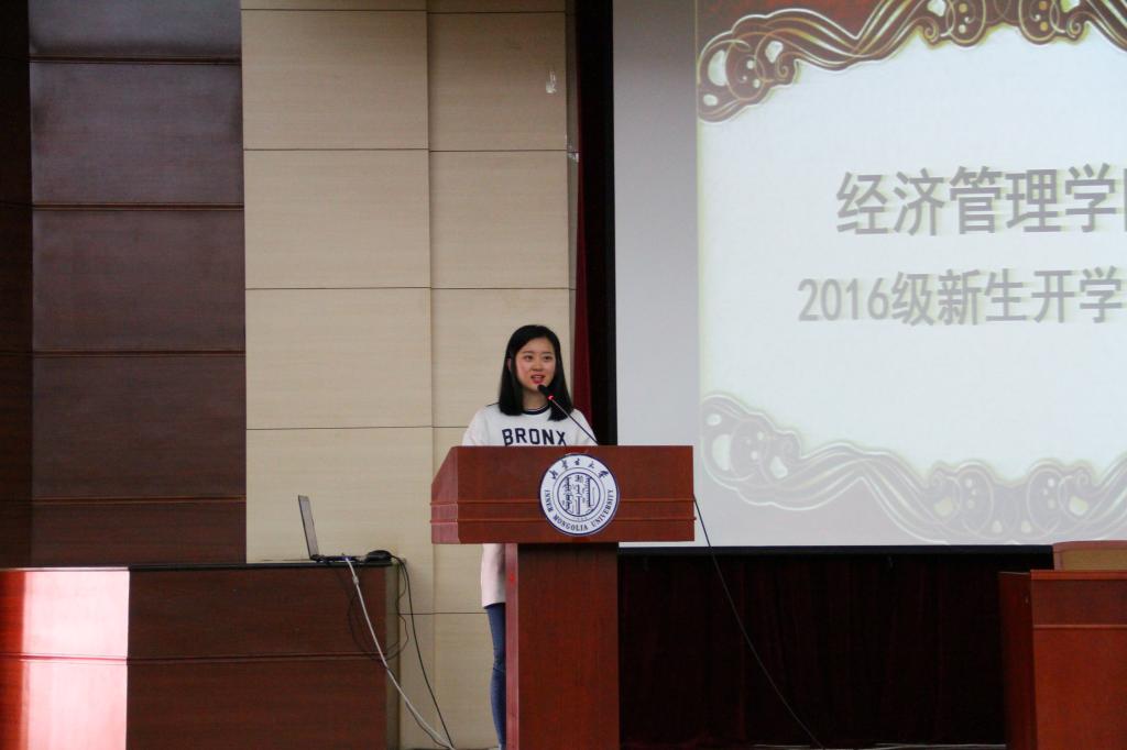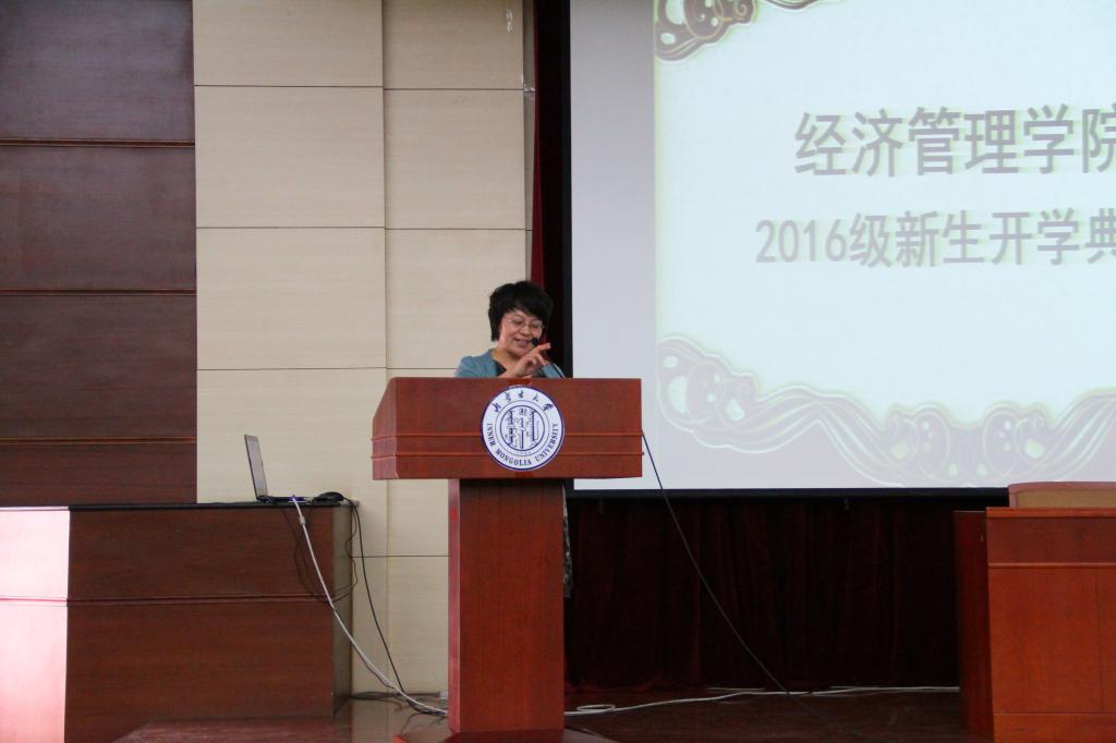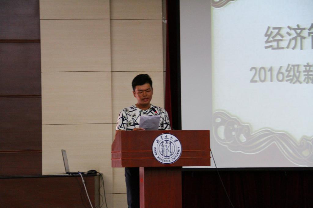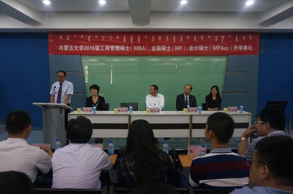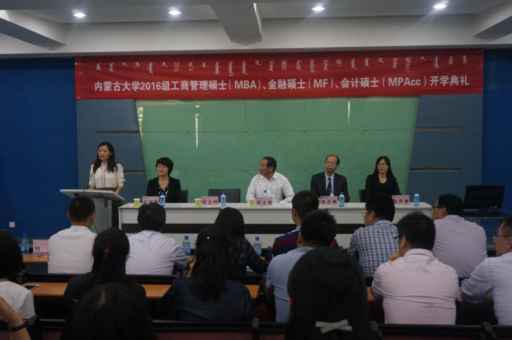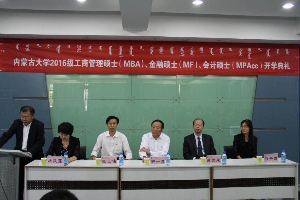 9月2日上午,我院2016级专业学位研究生开学典礼在经管楼116报告厅举行,学校副校长、学术委员会主任、研究生院院长班士良教授出席并讲话,研究生院常务副院长高光来教授以及新葡萄官网amg党总支书记张士伟、副院长(主持工作)杜凤莲教授、副院长钱贵霞教授、副院长兼专业学位教育中心主任姜涛教授出席,工商管理系主任兼专业学位教育中心副主任王锋正副教授、管理科学系主任兼专业学位教育中心副主任张启锋博士、会计系主任兼专业学位教育中心副主任颉茂华教授、行政办公室负责人秦慧丽、硕士研究生辅导员周瑜博士、专业学位教育中心办公室主任刘孜和刘婷、张鑫,以及2016级MBA、MF、MPAcc全体新生参加了会议。姜涛副院长主持了仪式。开学典礼在庄严的国歌声中开始。班校长在讲话中希望专业学位研究生不做空头理论,要深入实践。在学习中,互相促进、互相提高,锻炼自己发现问题、解决问题的能力。杜凤莲院长在会上希望大家能够对自己、对学校负责任,专心学习,传播正能量。来自内蒙古征信服务股份有限公司的董事长、2015级MBA—A班学员王玖玉和内蒙古金融资产管理有限公司的行政经理、2016级MBA—A班萨仁高娃分别代表老生、新生在会上发了言。
