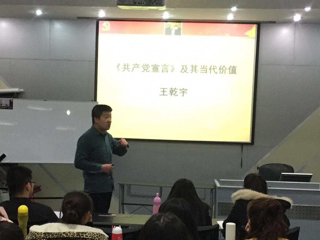 学院青年教师王乾宇博士主讲了《共产党宣言》,以其对《共产党宣言》的深刻理解,诙谐幽默的讲课方式以及大量的通俗易懂的生活实例,让本身枯燥难懂的共产党宣言内容瞬间变得那么容易让人接受,同时同学们的热情也被点燃,纷纷参加讨论,积极回答问题。