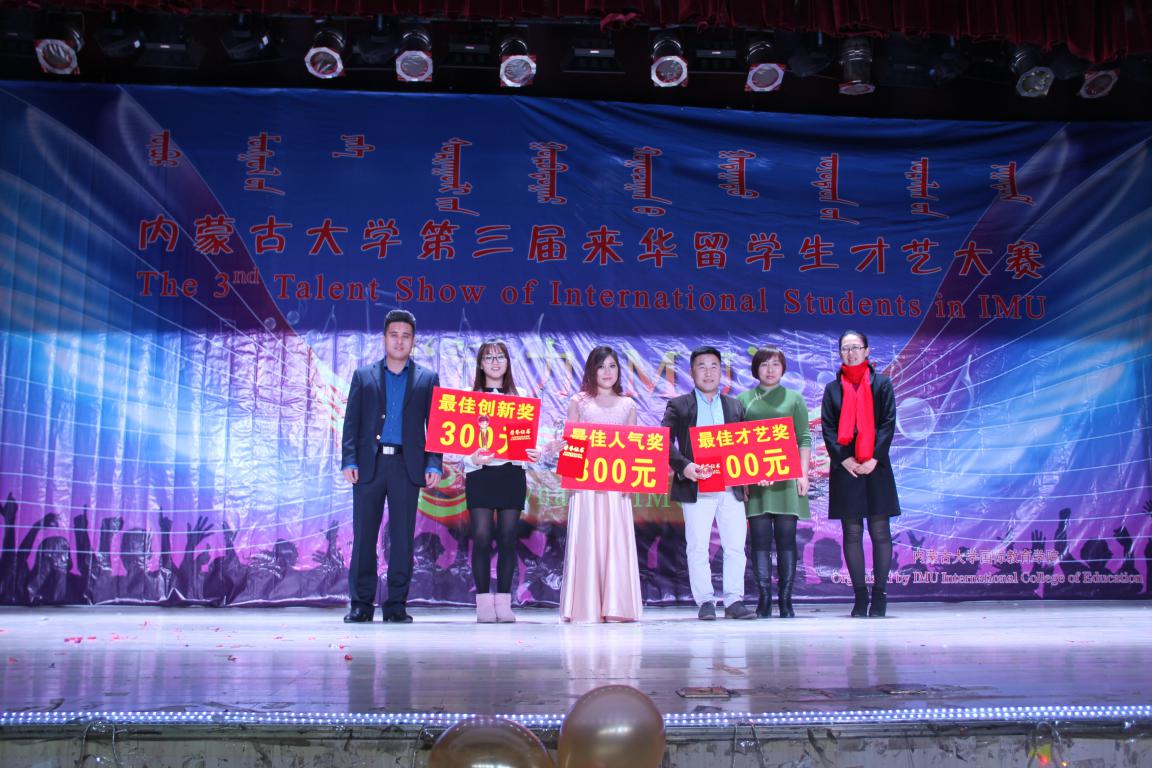 2016年12月9日,新葡萄官网amg第三届来华留学生才艺大赛落下帷幕,一批留学生展示了才艺,收获了快乐,而与他们一起收获快乐的还有我院研究生。在我院深造的蒙古国留学生尼玛吉日嘎拉、吉祥、宝日乐琪琪格分别获得二等奖、最佳人气奖和最佳创新奖,蒙古国留学生乌仁陶格斯和老挝留学生安佳丽也发挥出色,取得优异的成绩。这些可喜的结果离不开留学生们的自身努力,同时也与我院部分研究生的辛勤付出和无私奉献不可分开。