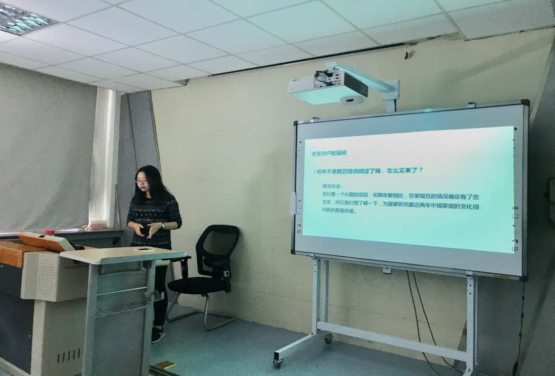 上午的培训会,谢昕老师先从与被调研的受访户联络沟通、问卷访问规范与技巧以及正确找到受访户的技巧入手,为同学们讲解如何开展入户访问工作。并针对入户访问难、经常不被信任等问题用实例进行说明。