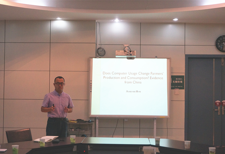侯建昀博士报告了来自中国主要苹果种植基地对苹果种植户的调研研究。报告关注的主要问题是苹果种植户使用电脑接入互联网是否能够降低其生产经营活动中的交易成本,增加其对果园的投资,并最终取得较好的经营业绩。要建立这一因果效应,不可避免地会遇到内生性问题。随后侯建昀博士介绍了研究中使用的2种缓解内生性问题的方法:工具变量方法和倾向得分配比法。