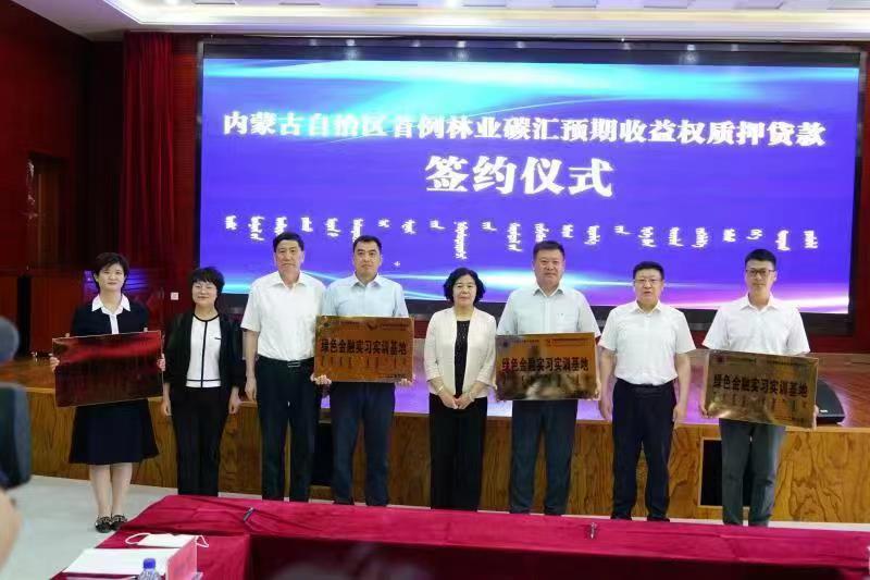 2022年6月15日,在全国第十个低碳日到来之际,在自治区生态环境厅、新葡萄官网amg、鄂尔多斯市政府、杭锦旗政府相关领导的见证下,伊泰北牧田园公司与蒙商银行鄂尔多斯市支行在鄂尔多斯市杭锦旗举行签约仪式,以50万亩碳汇林项目碳汇预期收益权为质押品获得绿色贷款融资,迈出了自治区历史上碳汇权益质押的重要一步。同时举行了新葡萄官网amg绿色金融实习实训基地挂牌仪式。