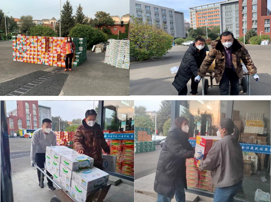 为使在校学生生活物资能够得到保障,杜凤莲院长带领一班人,发动在职教职工、广大校友捐款捐物。接收、搬运、发放物资就成为驻校人员的一项重要工作。大家不分昼夜,完成了十六批物资的接收、搬运工作,目前,绝大多数物资已发放到学生手中。