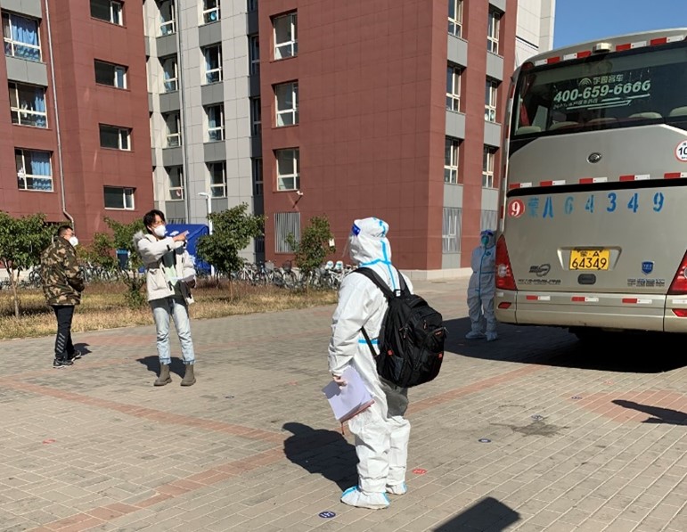 学生封闭管理后,学生的健康状况需要每天排查、梳理,核酸检测结果、今日校园健康打卡也要统计、督促。王锋正副书记、薛继亮副院长每天要负责研究生的数据统计,闫东祺副书记要完成本科生的数据统计。同时,还要做好密接、次密接学生的转运工作。学院前后有178名学生在不同时间转运到不同地点。侯建昀老师进驻校园后,第二天就带领密接、次密接学生赴外地进行隔离,侯老师变身陪伴学生的“大白”,给转运的学生带去满满的安全感。