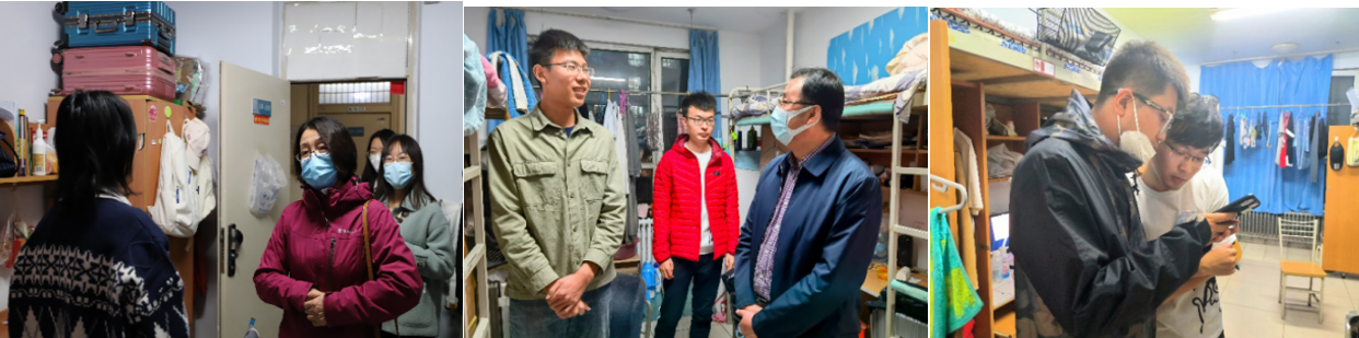 我院学生人数多,分散在两个校区居住,班级数量多、学生层次多。摸清学生底数存在一定困难。团总支副书记闫东祺组织学生干部,先后开展了三次排查,确定了在校学生准确人数。10月5日晚,学院党委书记李宏宇、党委副书记兼副院长王锋正、团总支副书记闫东祺深入北校区东院学生宿舍,与学生开展“面对面”交流。