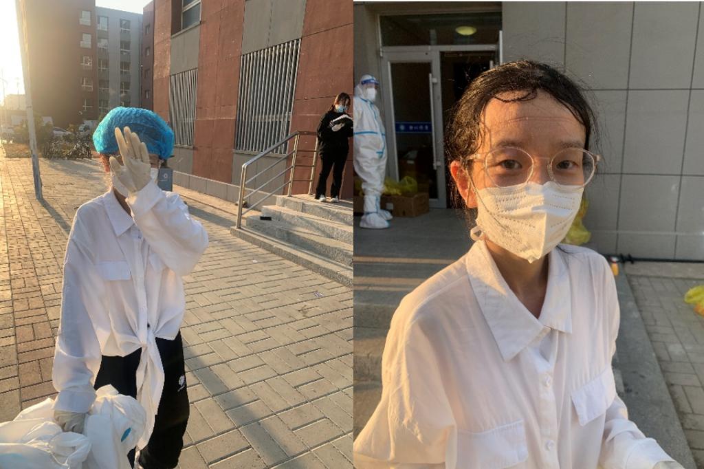 李明芮助管自10月3日开始,每天穿着防护服长达12小时,给师生做核酸检测,期间不能吃喝。自10月9日起,李明芮还要拿着全部检测用品,在学生宿舍六层楼里爬上爬下,到各宿舍进行核酸采样,瘦小的身体扛起巨大的责任。