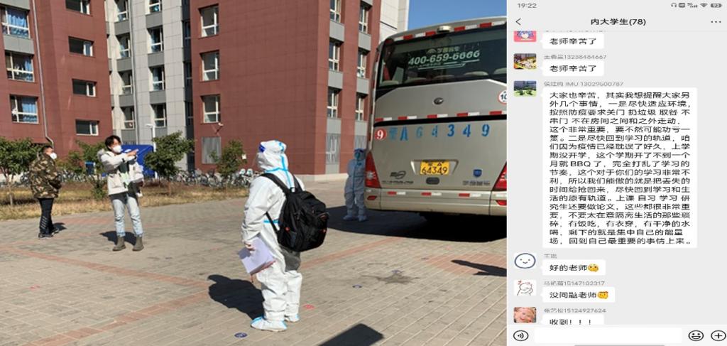 到达隔离点后,侯建昀同志尽心尽责,一方面协助医务人员做好疫情防控工作,每天督促大家监测体温、汇报核酸情况;一方面还要与属地防疫指挥部沟通,尽力解决同学们在隔离期间的学习和生活困难;同时还不忘细致地关心同学们的学习生活,为大家做好心理疏导。他多次提醒同学们即便隔离在外也要合理安排时间,不要忘记学习,他还向隔离点的同学们开放自己的课堂,用诙谐的语言帮助大家缓解压力。侯建昀作为唯一的随行教师,时刻谨记自己身上的责任,无微不至地从生活上和精神上为隔离的同学们带去爱护与关怀。