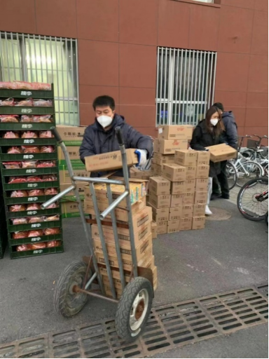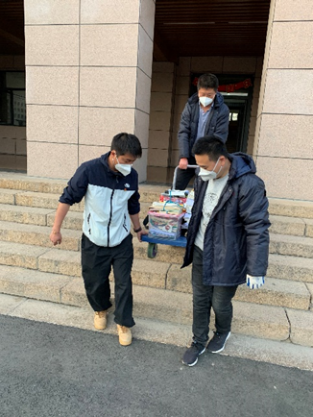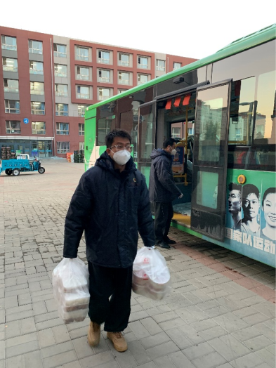 10月9日宿舍封控后,闫东祺老师成为学院“投喂小队”中的一员,学院筹集来的大量物资经由他的手,一件件从校门口搬到宿舍楼下,再由志愿者一件件送到学生手中。从同学们的一日三餐,再到给同学们增加营养的牛奶、香肠,再到保护同学们健康的口罩、消杀用品……校园里,闫东祺老师每天不知道要搬多少件物资,不知道拎多少趟饭,不知道走多少步路。一趟趟搬运物资的身影、因旧伤走路微跛的姿势,被同学们看在眼里、敬在心上。
