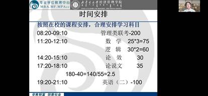何艳娇就许多学生关心的院校、专业的选择,以及备考建议和心得感悟等进行了详细的介绍。刘长扣重点讲述了考研的各科目复习、分数提升的方法。杨思雨结合自己会计学专业考研经验,详细介绍了时间安排、学习方法、心路历程、考研形势和院校选择等内容。王皓告诉大家要认真吃透考纲并利用好真题,还给大家传授了专业课、英语、政治的复习备考技巧。