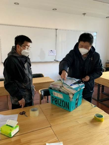 为了让学生早日用上存放在图书馆、教室的考试用书、电脑等,驻校教师用了两天时间,按照学生填报的需求信息,逐一打包,运到宿舍楼,由志愿者分发到学生手中。