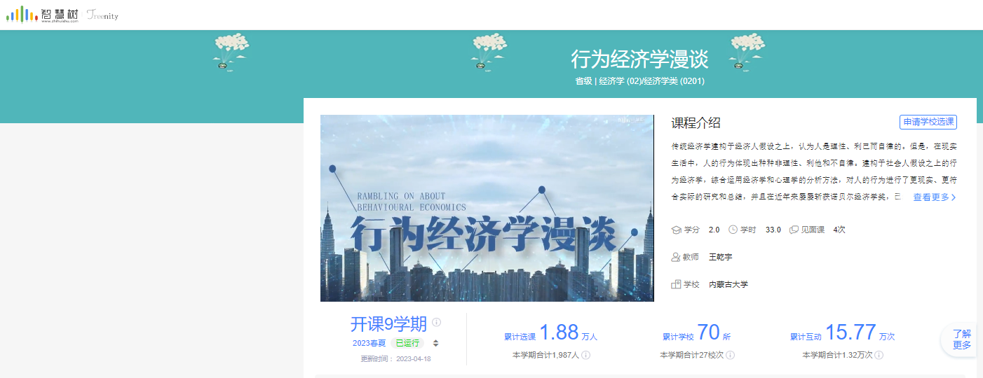 2018年启动后,经过一年努力建设,《行为经济学漫谈》于2019年正式上线运行,并在2021年被认定为内蒙古自治区高等学校精品在线开放课程,同年,以该课程为重要支撑的混合式课程《行为经济学》被认定为内蒙古自治区首批线上线下混合式一流本科课程,课程同步教材《行为经济学》在国家一级出版社——经济科学出版社出版,并被多所学校使用。多年来,课程主持人王乾宇老师不忘初心,践行立德树人,深耕三尺讲台,获得了校内外的高度评价,荣获2022年新葡萄官网amg首届“新葡萄官网amg‘培根铸魂’新时代教师楷模称号,2023年新葡萄官网amg第三届教师教学创新大赛特等奖,第三届内蒙古自治区高校教师教学创新大赛一等奖。目前,《行为经济学漫谈》在智慧树平台的选课总量已达1.88万人,选课院校70所。该课程践行高校服务社会,社会效益显著,于2020年被遴选到《学习强国》平台,总点击量超过30万次。同时,该课程也被多个UP主转到大型视频网站——哔哩哔哩,点击量超过十万,深受广大高校学生和经济学爱好者的喜爱!
