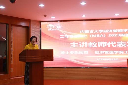 2023级张静同学代表新生发言。她表达了被内大MBA录取后的骄傲自豪的激动心情。她代表MBA2023级的同学们向学校、学院表态,在校学习期间,会以最饱满的热情,最全面的投入,最实际的行动严格遵守校规校纪,服从学校安排,认真完成学校的课业要求,不负内大校院领导和老师的教诲和期望。