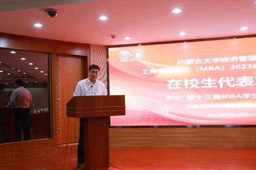 在学生发言环节,2021级学生、MBA学生会轮值主席李宁同学代表在校生发言。他表达了入学2年以来的感想和收获。他说同学们都会感受到内大MBA是一个学习知识、交流经验、启迪思想、创新思维、感受快乐、延伸生活的平台。期望师弟师妹们享受学习,按期顺利毕业。