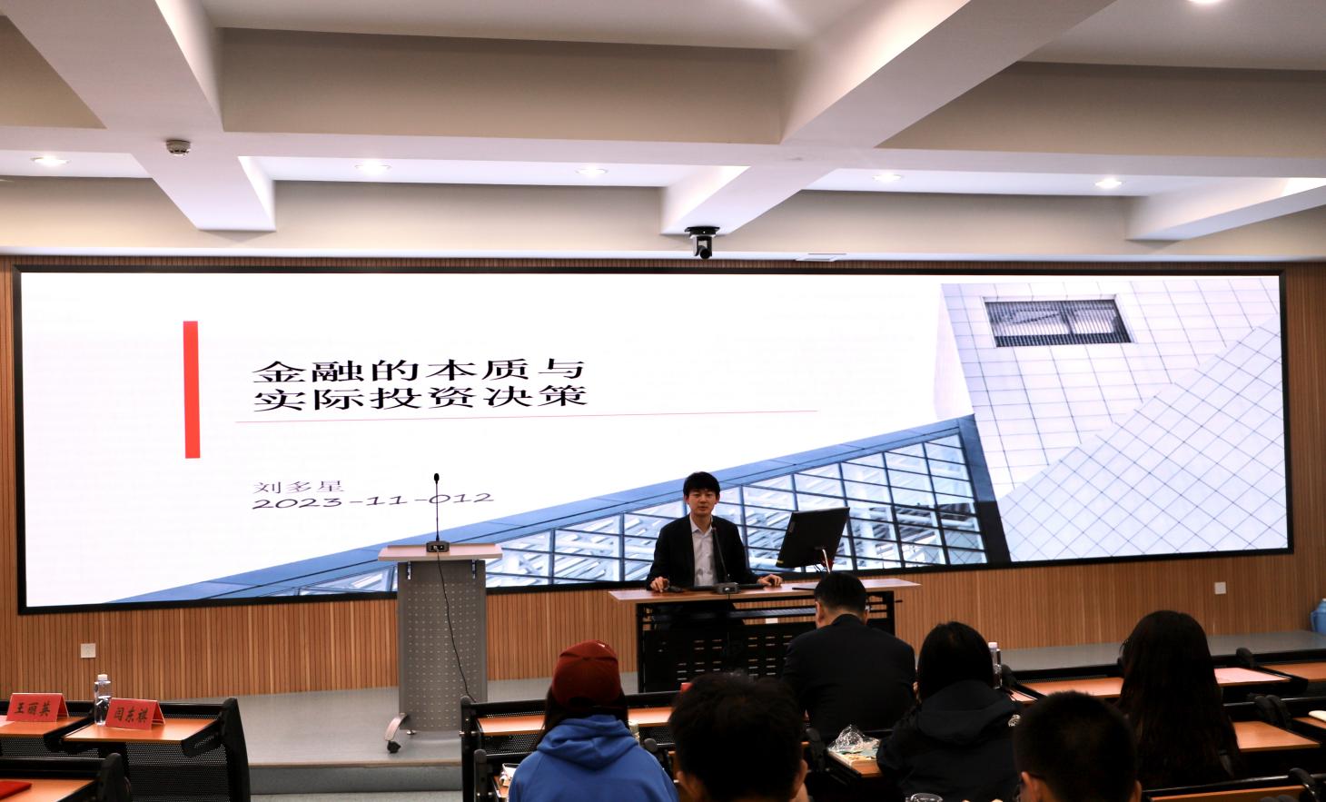 刘多星以“金融的本质与实际投资决策”为主题,结合个人工作经历中的所见所闻,鞭辟入里地讲解了有关证券行业的基础知识,令同学们受益匪浅。在讲座中,他讲述了近年来人民币及房价的变化、海外市场的变动情况,以此为基础向同学们介绍了投资组合管理的基本原则、风险管理策略、投资决策的基本方法。之后还耐心地为同学们答疑解惑,加深了同学们的理解。