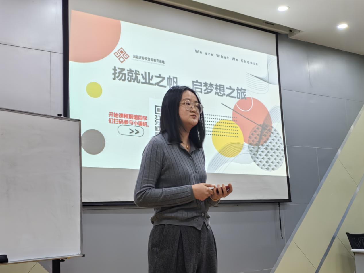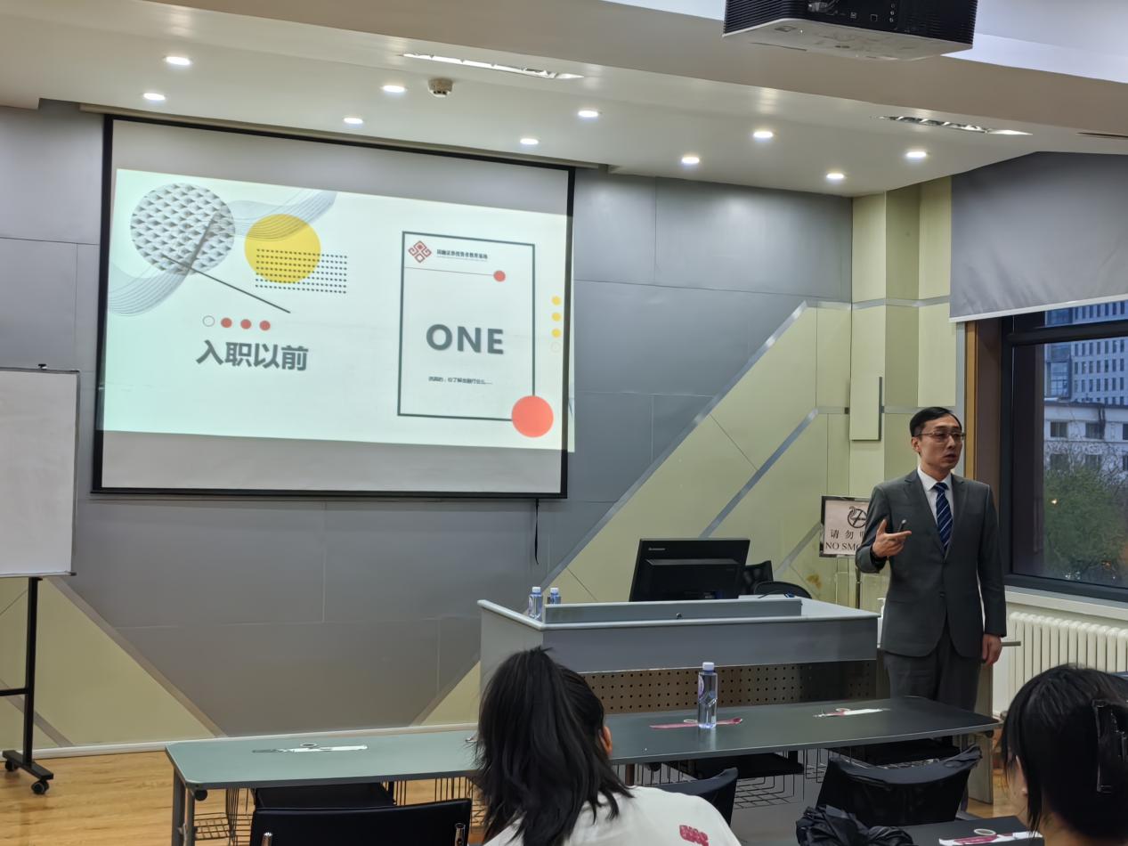 主讲人王知白首先对金融市场和证券行业从业情况进行了介绍,重点讲解了证券行业前台、中台、后台的组织架构以及员工在行业内的晋升通道。他提醒学生在参加招聘面试前要对公司和职位进行充分探索,提高面试成功率。王知白还就目前证券行业校园招聘情况进行了分析,强调了实习实践经历对求职面试的重要性。最后,王知白针对如何适应职场生活进而在职场中快速成长给出了指导性建议,鼓励学生们要注重发展沟通能力、学习能力和协作能力,为今后职业发展做好准备。
