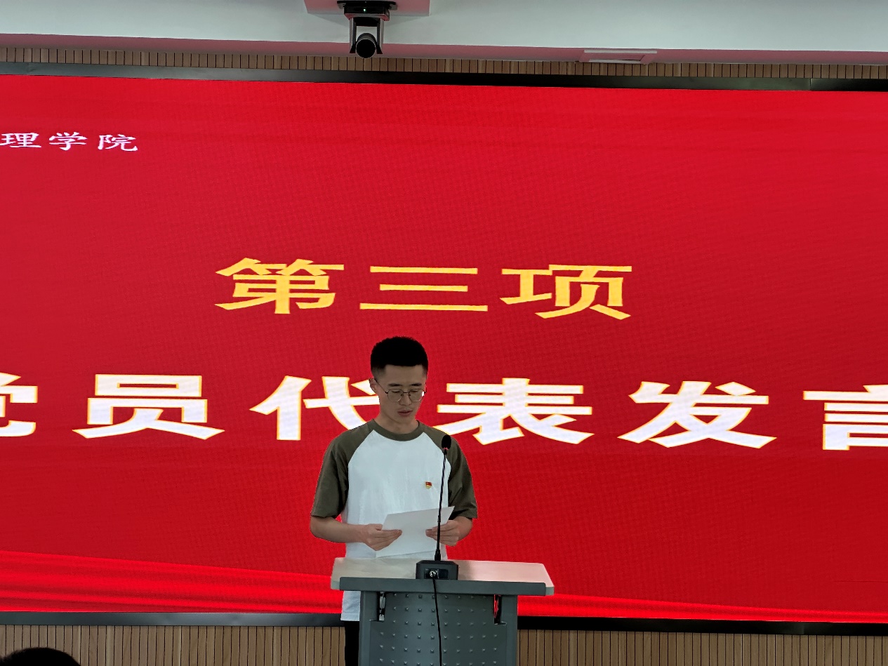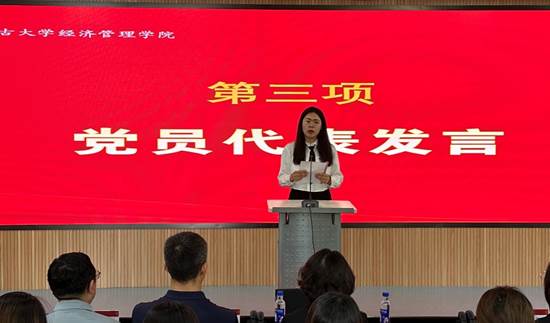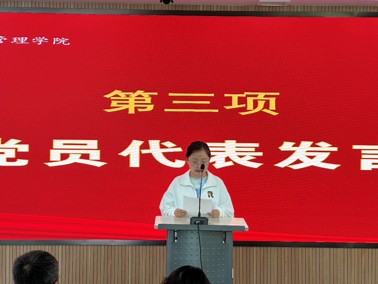 工商管理研究生党支部王晓晶同志、本科生二支部张园同志作为新发展党员代表发言,她们表达了加入党组织的喜悦与自豪,表达了坚定为党和人民事业奋斗终生的决心。