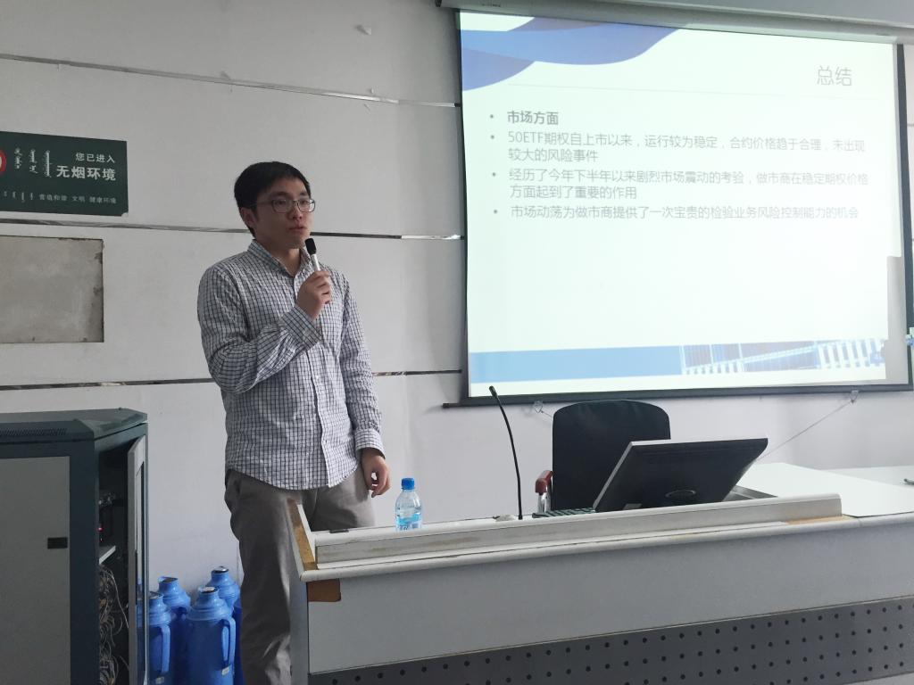本次讲座由中泰证券衍生产品部任志远主讲。任志远老师详细介绍了期权做市商制度、期权交易策略、Delta中性交易、Greeks优化与联动关系、持仓风险管理等,耐心解答了现场老师和同学提出的关于资本市场、Delta中性套利、做市商风险敞口、未来资本市场发展趋势及职业规划等相关问题。